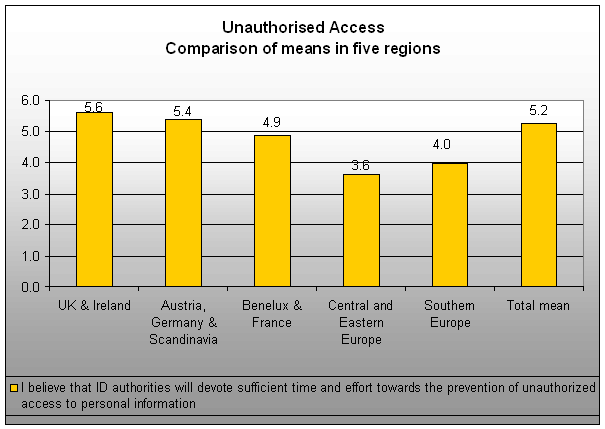 Respondents tend to disagree that the ID authorities will devote sufficient time and effort towards the prevention of unauthorized access to personal information. Here again, UK and Ireland rated highest (5.6), and Central and Eastern Europe and Southern Europe were lowest.