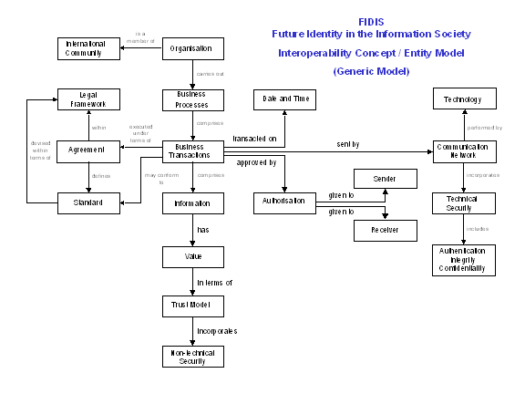 The model shows the particular areas of interest concerning interoperability and their relationships with one another. The reader should bear in mind that the model is not a flow diagram; it is in the form of an entity-relation diagram or concept model and represents the structure of interoperability activities.