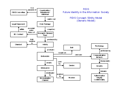 Entity models specify the relationships between such entities as people, objects, processes, and information within and between institutions.  They are used to brainstorm, or when working from a fresh start, to specify and resolve business issues and to define the related corporate information. An entity model for information management within FIDIS is shown in Figure 4. It is a generic model, which may be applied by each Work Package.