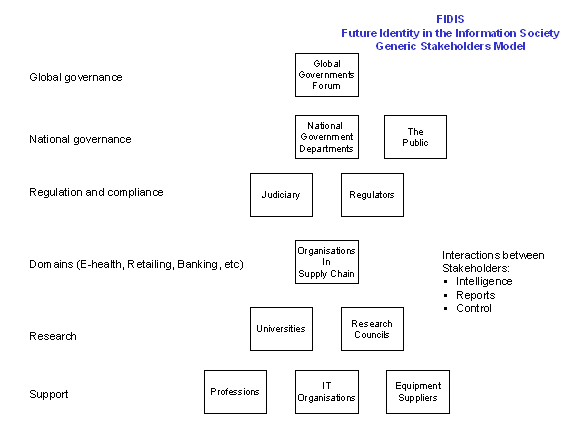 Stakeholder models highlight the different stakeholders who are involved in the various activities of identity management throughout the supply chain. Stakeholder models may be created for particular business sectors, such as e-health, and they may be used as a basis for information flows within and between stakeholders. In Figure 5, some of the stakeholders involved with identity management are shown at differing levels of governance:
