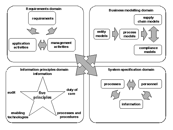 The method is separated into four domains, developed by the authors, as shown in Figure 1, namely the requirements domain; the business modelling domain; the information management principles domain; and the system specification domain. In FIDIS these domains cover all aspects of identity management.