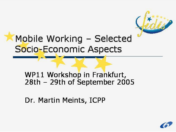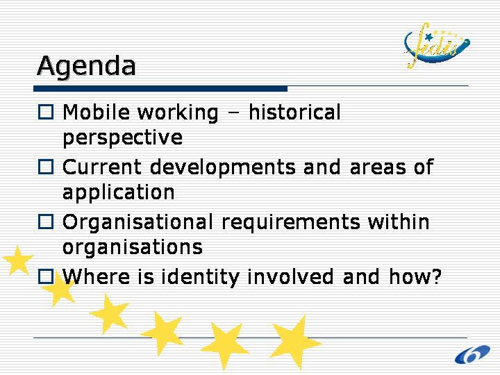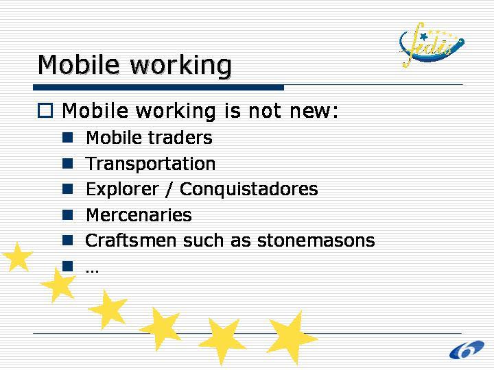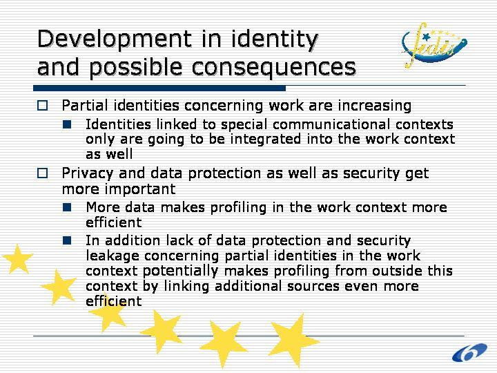 In this presentation, the changes of identity caused by mobile work in combination with mobile communication were highlighted. Organisational requirements that have to be met by enterprises introducing mobile work were analysed using the model of partial identities. Five of these requirements showed the potential to cause changes in identity: