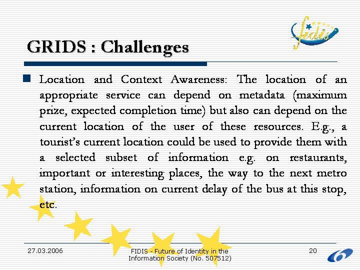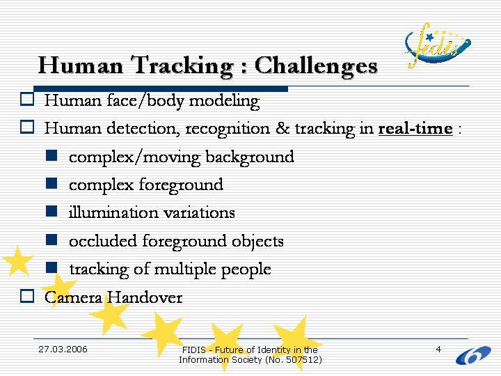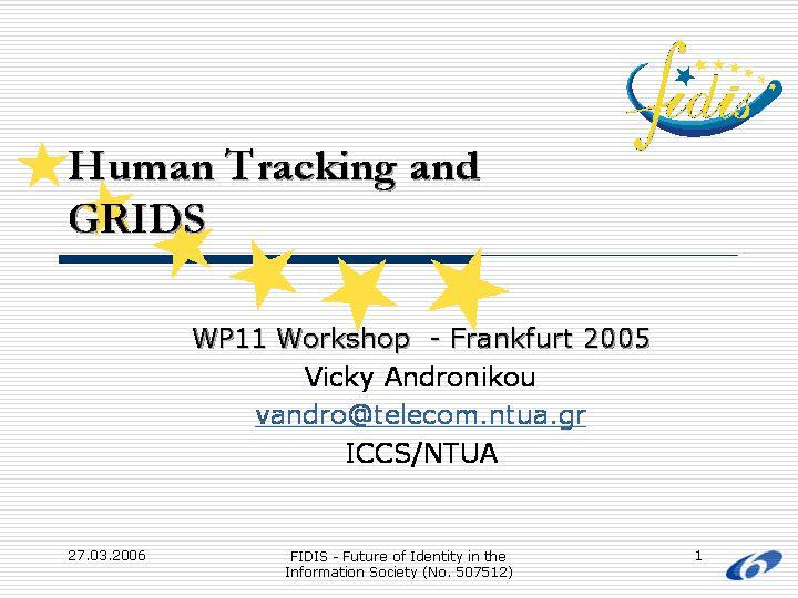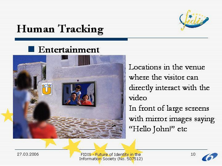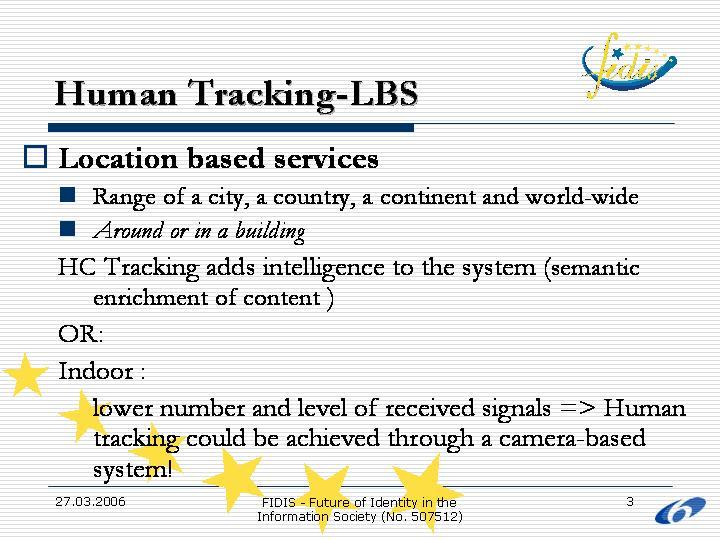 This presentation consisted of two parts. The first part focused on camera-based human tracking, a way of either assisting the provision of location-based services in areas where signals are of low strength or poor quality or adding intelligence to the system through semantics. Scenarios and areas of application of the aforementioned technology were presented. The second part included a brief introduction to the GRID as a way to provide the location-based services and assist mobility in a more efficient way.