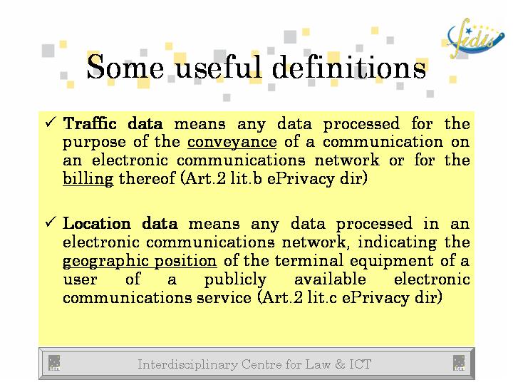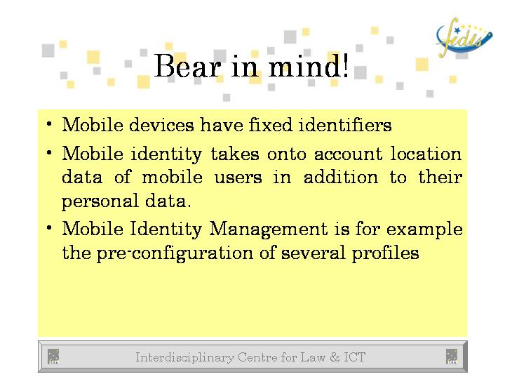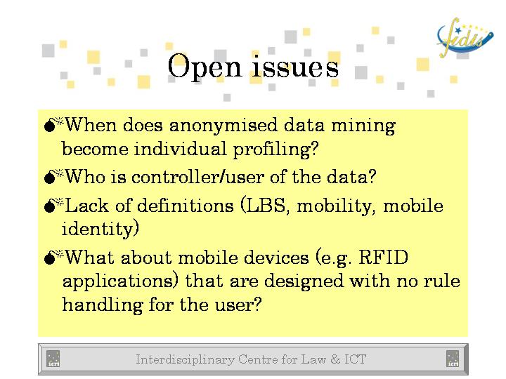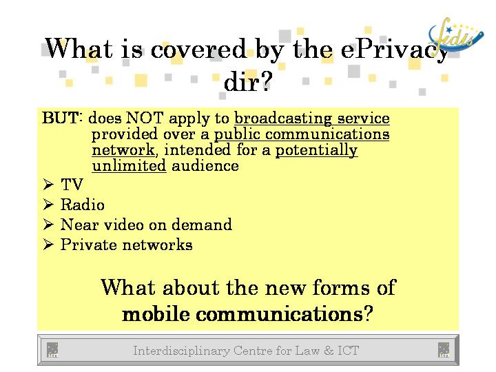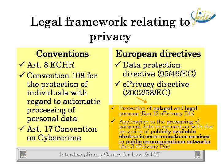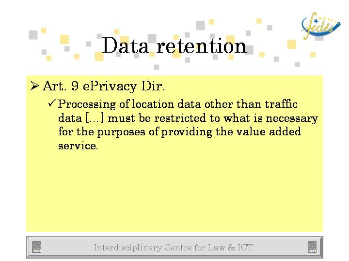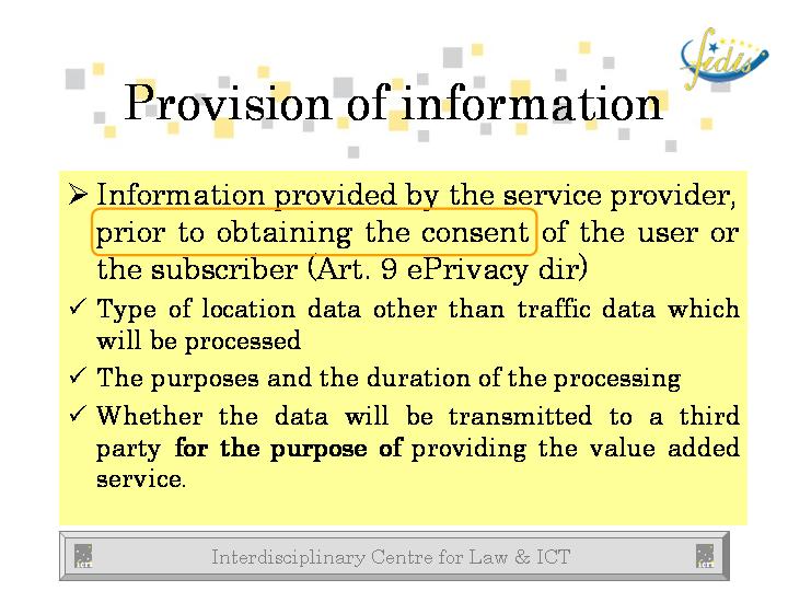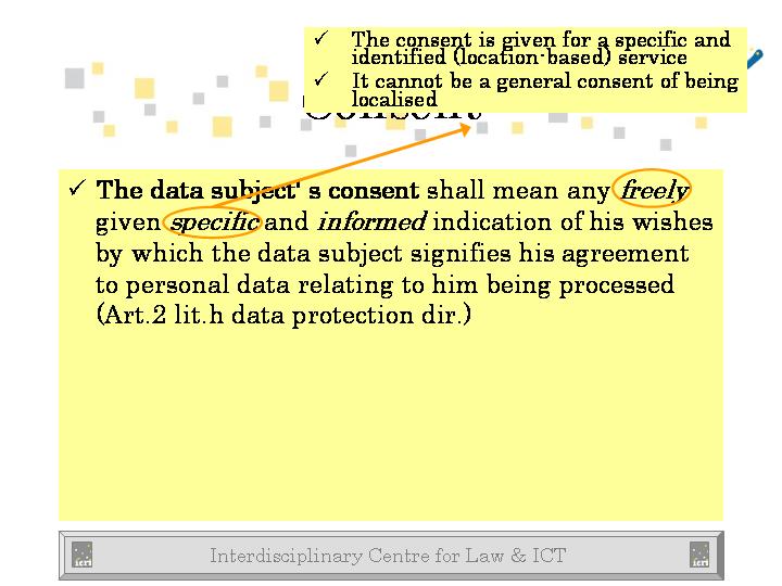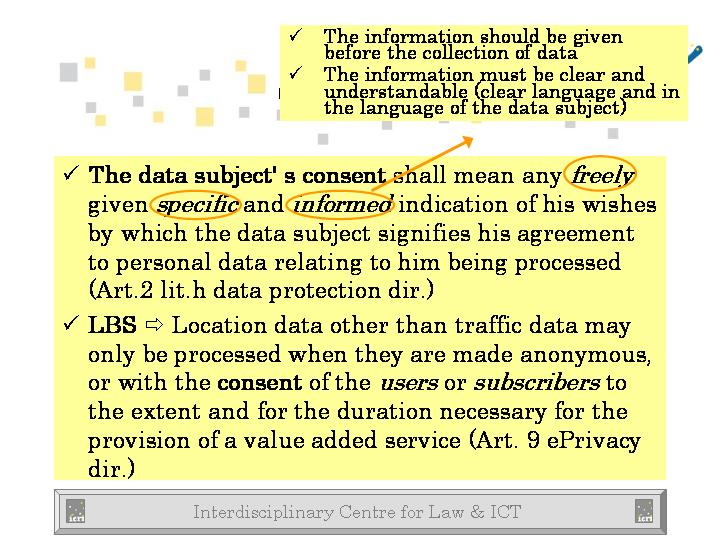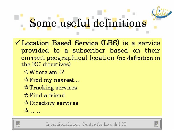 The current legal framework is mainly based on two European directives, the data protection directive (1995/46/EC) and the ePrivacy directive (2002/58/EC); ICRI shall apply the existing framework to mobile communications. For D11.2 we will apply the current legislation on LBS in use cases and we will also try to spot the issues that the current legislation does not cover. Many questions arise with regard to ‘consent’ (who shall give it and who shall be the recipient, how and when shall it be given and how can it be withdrawn), to data retention, to the protection of minors etc. Our main goal is, apart from providing an overview of the existing legal framework related to the mobile communications, to contribute practically to the resolving of the scenarios that will be chosen.
