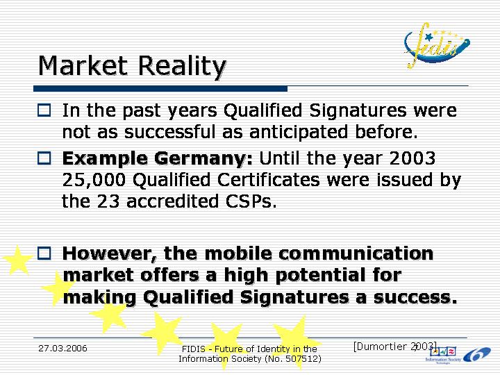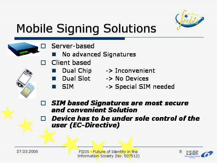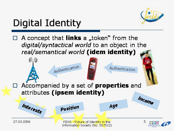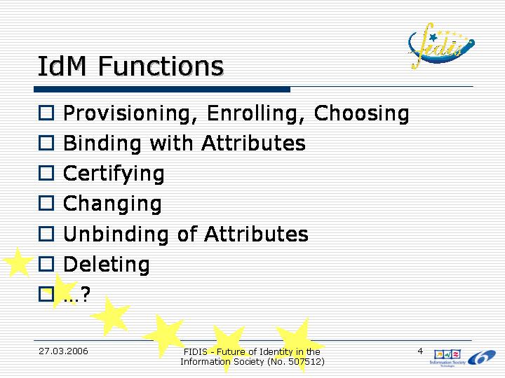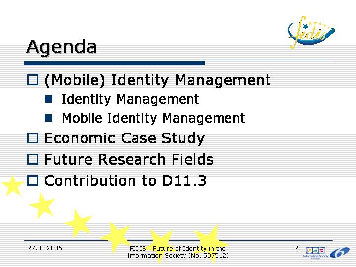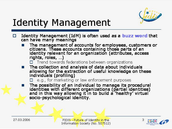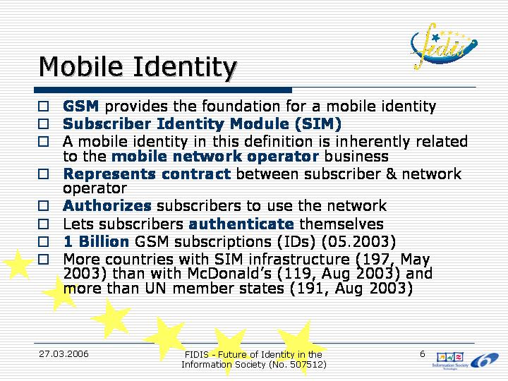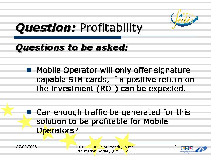 Identity Management (IDM) is often used as a buzzword that can have many different meanings, ranging from the management of user data to the collection and analysis of data (profiling). However, the systems used to perform such actions are costly and it is difficult to anticipate their value for business organisations, etc. This presentation gives an example for an evaluation approach for mobile IDM technologies.