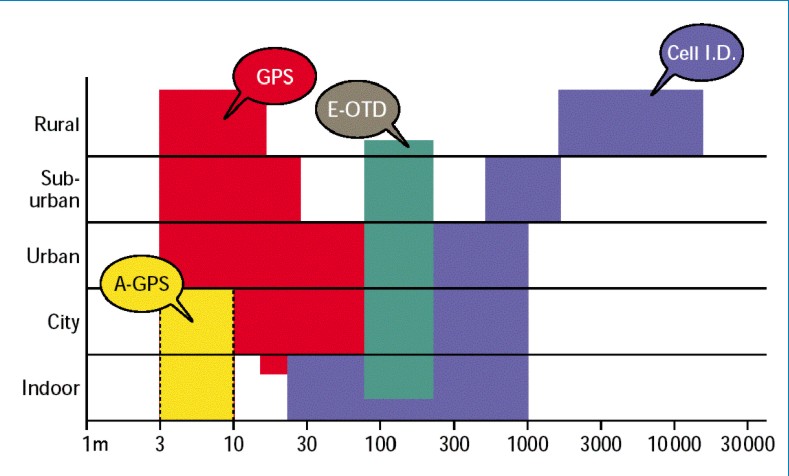 Figure : Location Technologies used in Cell-based communication Networks (in GSM: A-GPS, GPS, E-OTD, Cell-ID) and their Accuracy