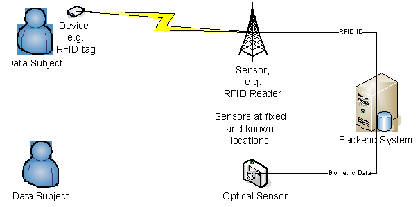 Static sensors and mobile devices or objects bearing or transmitting location information; in this case the location information is given by the position of the identifiable sensor and can be interpreted using, e.g., reference databases (cf. ), and