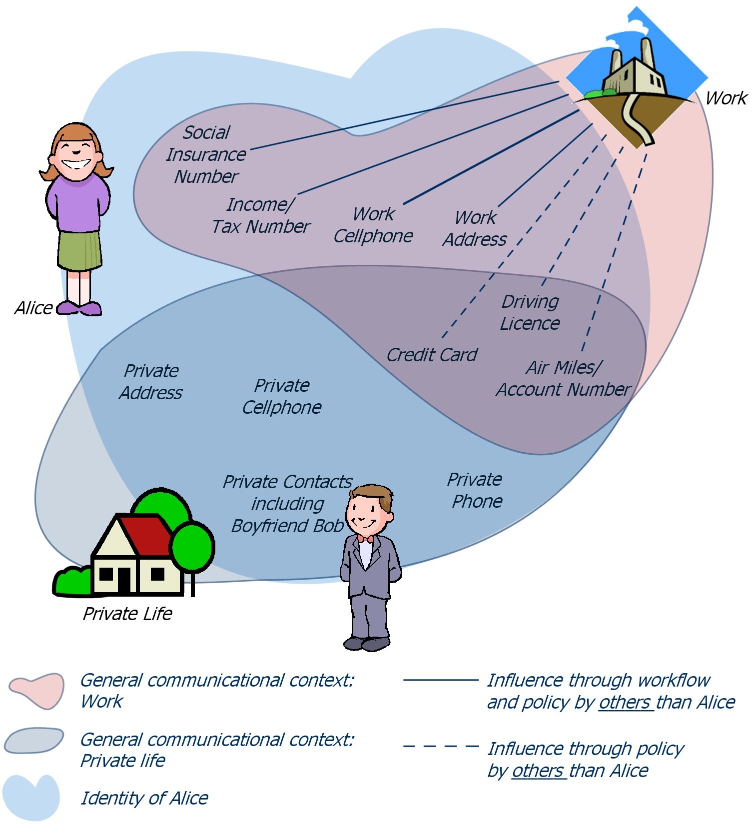 In this case the changes in identity are much more intense compared to the two prior scenarios. Highly flexible working hours in combination with the communicational policy of her employer lead to a change of borderlines of communicational contexts in which identifiers are used. In addition the control over those identifiers and the related communicational policies by Alice has diminished. When sitting in a restaurant with Bob having a romantic dinner she has to answer the phone when a customer of her employer is calling. This clearly has the potential to spoil the evening.