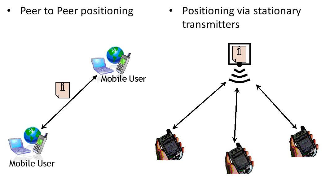 Figure : Peer to peer versus stationary transmitter positioning (e.g. by radio or infrared beacons).