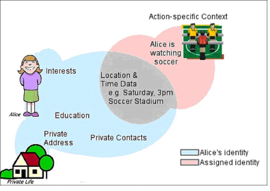The external geo context information is a soccer match that takes place in the stadium at this point of time. A possible assumption and extension of Alice’s mobile identity could be that Alice is currently watching soccer. Any person or service that has this background information about Alice’s location can attribute this (subjective) action specific context to her identity creating a profile of Alice.