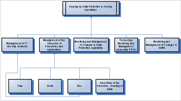The following process step includes keeping up the reached level of data protection in running operations. Supported by a number of sub-processes (cf. ) this process restarts the core process in case significant changes require this, leading to a cyclic process model. The strategic level of the core process needs to be repeated in cases of fundamental changes only. Though the targets of the DPM process (i.e. compliance to data protection legislation) and the IT-security process (i.e. the required level of confidentiality, integrity and availability) differ, these processes can be used in close accordance.