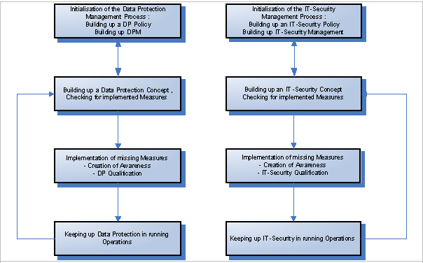 The DPM process model consists of two parts: a core process which is accompanied by a number of supporting processes. This process model was developed in close accordance to Baseline Protection to show potential synergies with the corresponding IT-security management process. The following figure shows the DPM core process (left) in comparison with this security management (core) process (right).