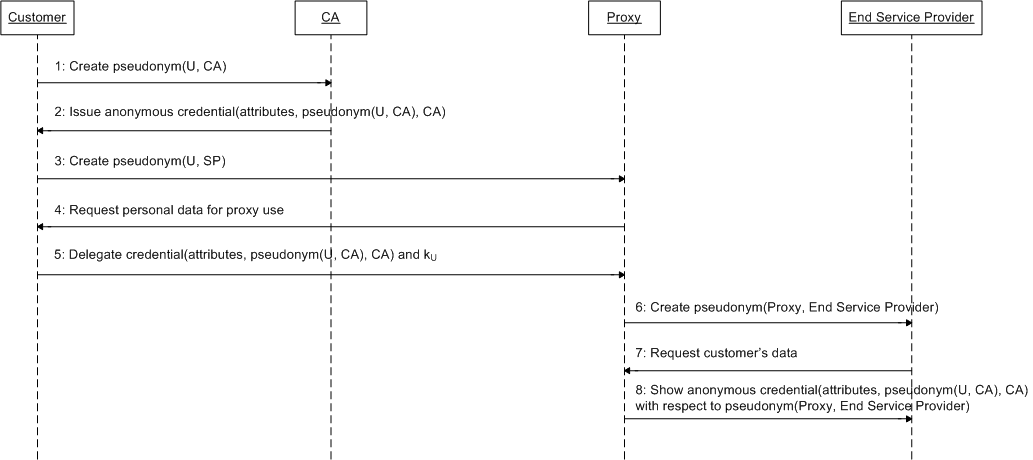 Figure 5.19 shows the use of IBM idemix for a business process with a proxy. Steps one to four proceed analogously to the use of IBM idemix in a single-stage business process. In step five, however, must the customer transmit his secret key kU with the requested data, in the form of an anonymous credential, to his proxy so that he can use this anonymous credential in the eighth step where the target service provider is concerned. The transmission of the secret key kU is based on the all-or-nothing non-transferability attribute of the IBM idemix system.