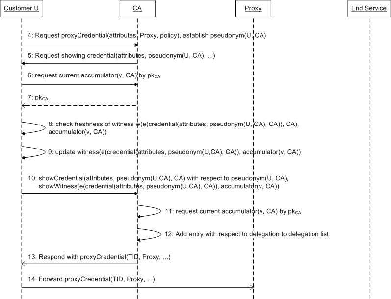 The transmission of the secret key kU does not present a possibility due to the resultant loss of control of the customer over his identity. The second possibility also does not come into consideration. If a customer were to issue an anonymous credential for his proxy, then the customer is firstly identifiable by way of the digital signature of the credential and, secondly, these credentials must be accepted by the end service provider. The third possibility is therefore selected: a certification authority issues anonymous credentials for the personal data to be delegated and their attributes on behalf of the customer to his proxy. In addition, the customer sends an authorisation for the use of the personal data required to his proxy.