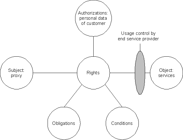 The proxy role is the central focus of the privacy policy. According to the terminology of usage control (Park and Sandhu, 2004), the subject is a service provider or proxy, the object is the requested personal data or its assertions and the types of rights then result from the assigned authorisations, conditions and obligations. A privacy policy together with an authorisation presents the relationship and defines the use of personal data as follows:
