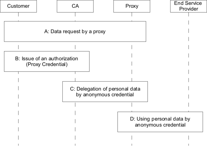 Multi-stage business processes are characterised by a proxy of a customer having to obtain the customer’s personal data so that he can make use of subsequent services in the interests of his customer. Personal data of a customer is, on the one hand, the object of access and, on the other, an authorisation for the proxy to obtain access to services of a further service provider. There are several options for a customer to delegate personal data and with it the receipt of a relevant anonymous credential for a proxy. He can either delegate his secret authentication token for anonymous credentials, i.e. his secret key kU, issue an anonymous credential with the relevant data himself for his proxy, or have it issued by a certification authority.