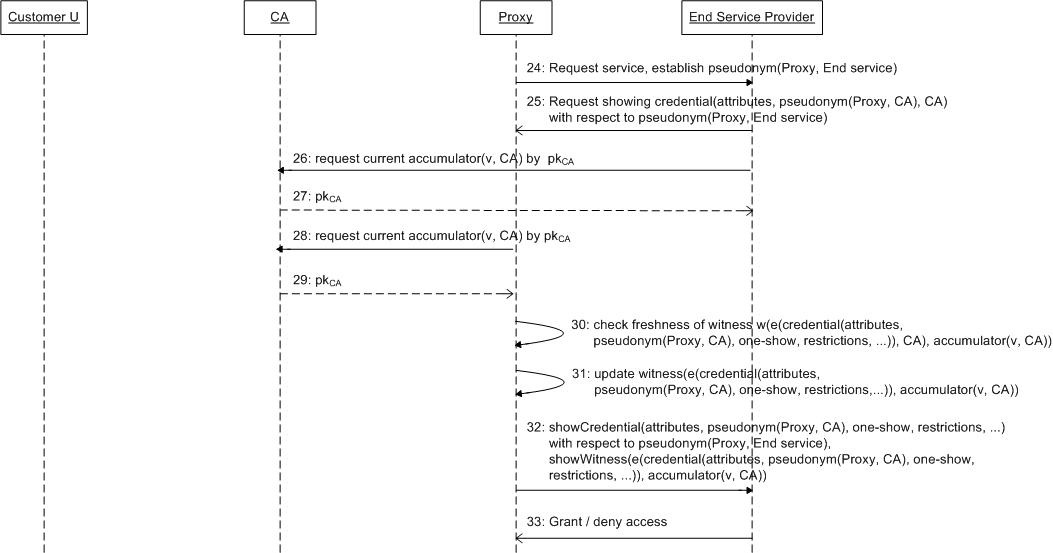 Steps 17-22 relate to the issue of the anonymous one-show credential for the proxy. The usage rights for the use of the data are entered in the credential under the restrictions field. According to the model of usage control, this can involve both obligations and conditions for the use of this data. A further feature of this credential is the fact that it is a question of an anonymous one-show credential. Multiple use of an anonymous one-show credential is detected by the service where the one-show credential is used for the second time (Camenisch and Lysyanskaya, 2001). The incentive for a proxy to use a one-show credential once at the most lies in the encryption of a secret of the proxy, e.g. his private skProxy key, in the credential and its disclosure, conditional on design, in the event of multiple uses. The hidden motive of this measure is to increase the damage of a proxy in a replay attack and thus prevent this type of attack. Further attributes of the credential are the customer data delegates, the pseudonym of the proxy, the name of the certification authority and the period of time in which the credential is valid. The period of time is specified by a commencement and termination date. Step 18 adds the prime number e(Proxy,CA) of the anonymous one-show credential to the accumulator accumulator(v,CA) of the certification authority and step 19 to the directory service entry Eadd. Step 20 updates pk’CA by the old accumulator being replaced by the new version. Step 21 publishes the updated directory service entry E’add and the new version of pk’CA. The credential produced is sent in step 22 to the proxy together with the new version of the public key pkCA. The key pkCA is sent in the form of a key certificate in order to secure its authenticity. Finally, the proxy produces the witness for this credential. The current accumulator is extracted from pk’CA. Step 23 is optional, but should be executed before the initial use of the credential. It is thereby assumed that the authenticity of the customer data can be shown by the proxy.