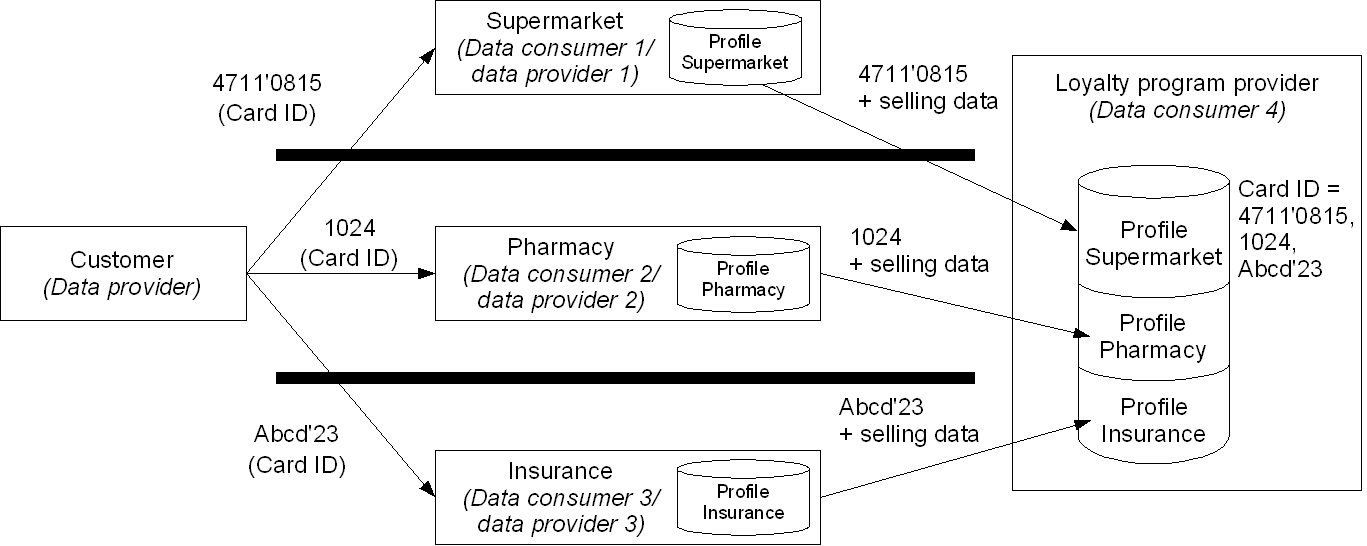 The transactions in Figure 6.12 cannot be traced back to the customer by the merchants, if there is no intersection in the disclosed data. The customer uses different pseudonyms 4711’0815, 1024, and Abcd’23 in combination with his loyalty card as an anonymous credential. Since an anonymous credential hides its data, it is shown in Figure 6.12 in brackets.