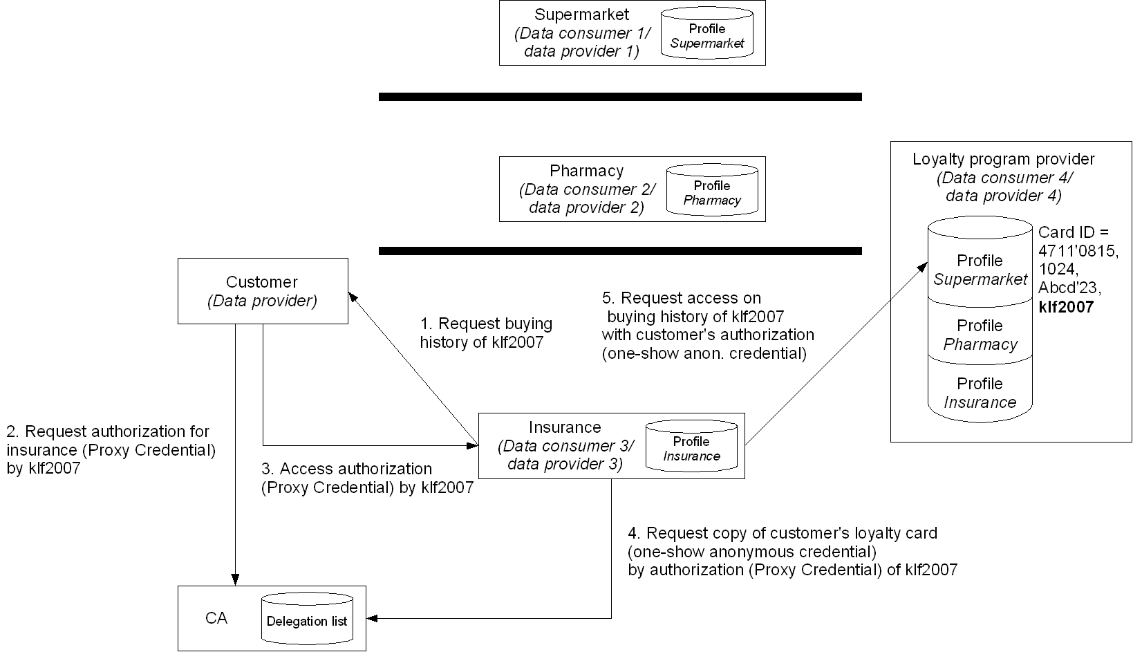 The customer uses the pseudonym klf2007 in order to remain unlinkable between the transaction with the insurance company and those with the pharmacy in the past. After the request of a merchant (insurance company) for accessing the profile pharmacy of the customer (phase A of DREISAM), the customer requests the corresponding authorisation for the insurance company at a certification authority. The result of step two, which is phase B of DREISAM, is the authorisation for the insurance company realised by a proxy credential. A customer has to show that his pseudonym klf2007 belongs to the pseudonym used at the supermarket (4711’0815). Showing this relationship may not lead to disclose the customer’s pseudonym with regard to the supermarket to the CA. Otherwise the CA is able to identify customer’s profile at the supermarket. Latter can be achieved by using a key-oblivious verifiable encryption scheme similar to (Camenisch and Lysyanskaya, 2001). Showing the relationship between two pseudonyms in a PKI with anonymous credentials means to show that they are both based on the same secret key kCustomer. This authorisation is forwarded in step three. Step four represents phase C of DREISAM: the insurance company, a proxy of the customer concerning the access on customer’s profile at the loyalty program provider, requests the copy of customer’s loyalty card by showing his corresponding proxy credential as the authorisation for this copy. By getting the copy of customer’s loyalty card, the insurance company is allowed to access customer’s supermarket profile in step five. Step five represents phase D of DREISAM. The relationship between the pseudonym klf2007 and the Card ID is again introduced to the loyalty program provider by the encrypted Card ID together with a random number nonce: enc(pkLoyalty program provider, Card ID || pseudonymSupermarket)