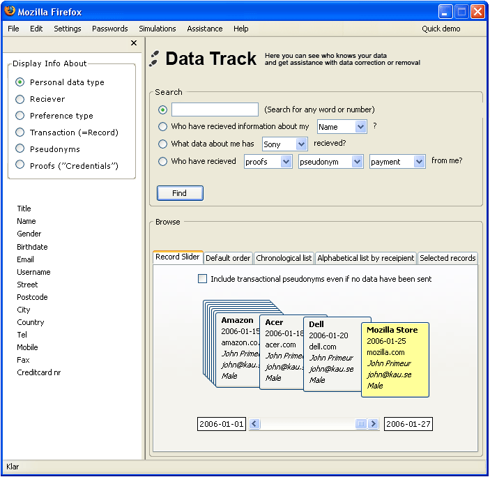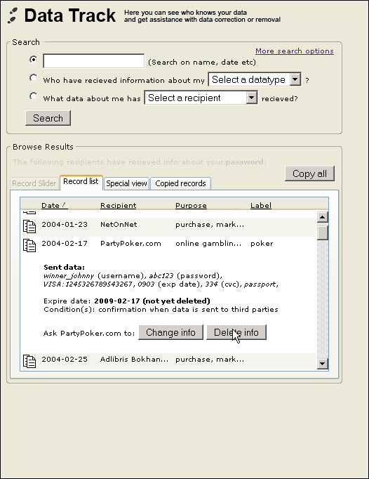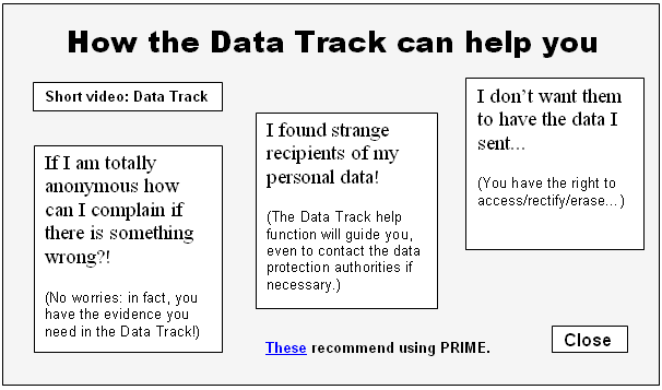 The Data Track allows users to “track” their personal data that they have released to other sites via data records kept at the end user’s side and via compiling requests for information on recording done at the services site.