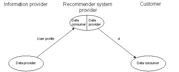Information filtering systems aim at countering information overload by extracting information that is relevant for a given user out of a large amount of information available via an information provider, based on user profiles containing, for each given user, personal data such as preferences, and/ or rated items. Information filtering systems may be applied in order to generate recommendations of items that are probably relevant for a given user, in order to predict the relevance of specific items for a given user, or in order to determine users with similar interests. Typical examples are the recommender system used by amazon.com which suggests potentially relevant books or other multimedia, based on the respective user’s preferences and shopping history. Another example is the recommender system used by last.fm which provides personalised song play lists. While in these well known cases the information provider and the provider of the recommender system functionality are realized by a single entity, information filtering systems in most cases constitute a multi-stage business process in which personal data has to be delegated from the information provider to the recommender system provider (cf. Figure 5). The information d in this case is the result data, e.g. a set of recommendations.