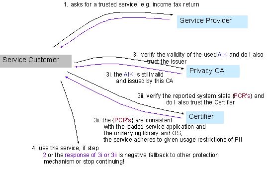 4. Service access: The user starts the service utilization when both the attestation results have a valid signature generated by a TPM and the information itself identifies an application with known properties with regard to privacy.