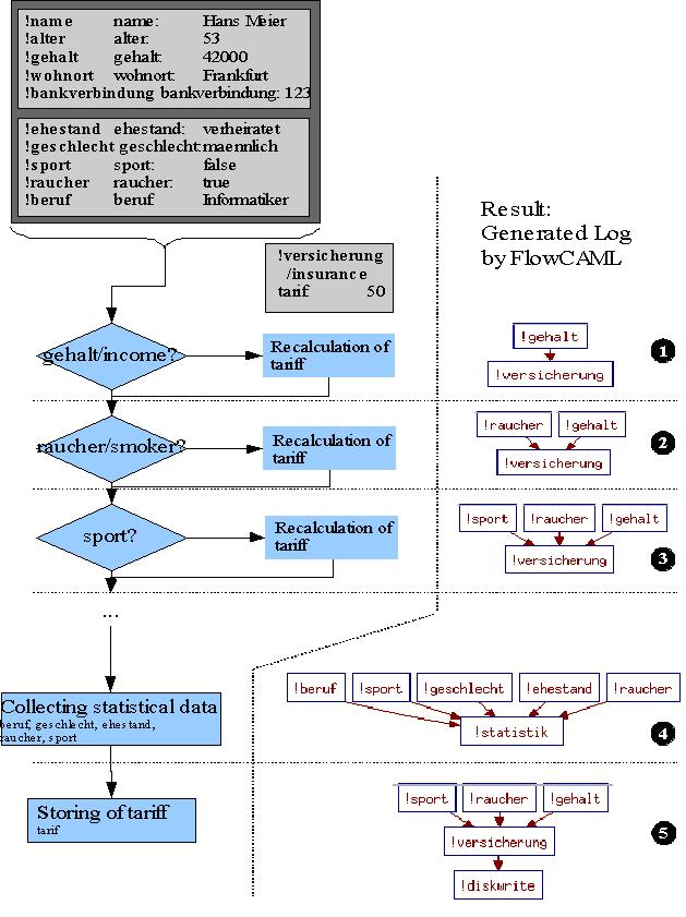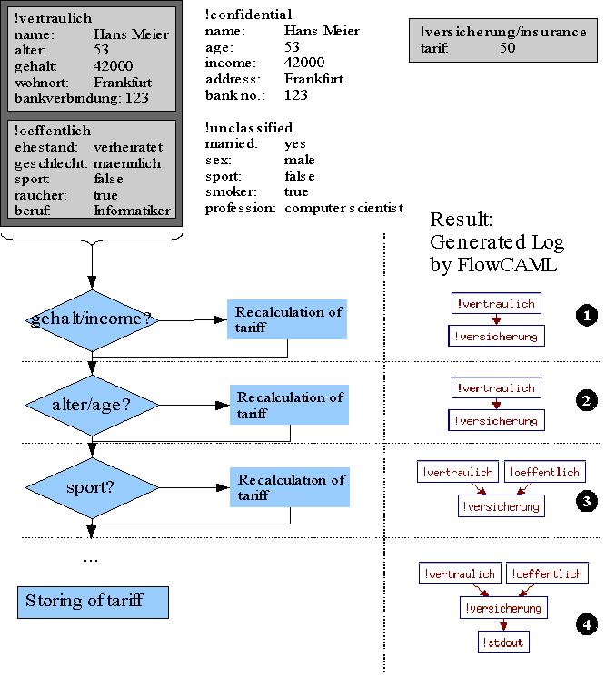 Protection-worthy personal data are classified according to their confidentiality with the security type confidential and the type unclassified. The objects of the insurance are marked with the security type insurance and the standard output channel with the security type stdout. The underlying application for the log in reads in some personal data of the user and by case differentiation on the basis of certain attributes calculates a tariff, which is subsequently issued. The left side shows the processing steps and the personal-related attributes involved. The log of the information flow that has taken place is illustrated in on the right-hand side.
