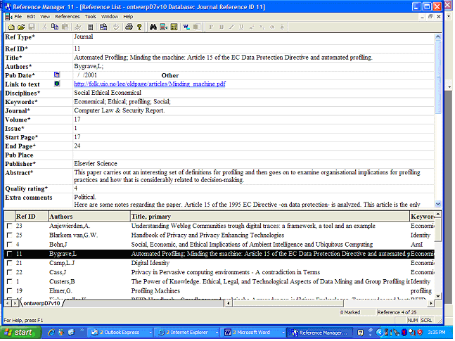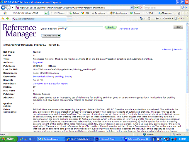 Figure : Screenshot of the literature reference ‘Bygrave ID 11’ found by searching for ‘profiling’ (front – end view).