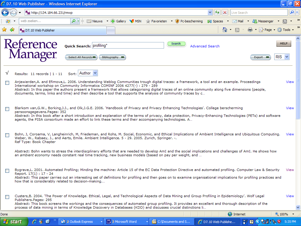 The literature selection can be accessed online by following the link on the D7.10 wiki page or directly at http://bibliography.fidis.net